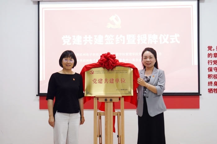 在庄重而热烈的氛围中,管理学院党总支书记潘慧灵与杭电后勤服务中心临安党支部书记潘昌兴共同签署了党建共建协议。随后,张馨艺书记与周爱娟书记共同揭牌,标志着双方党建共建工作正式启动。