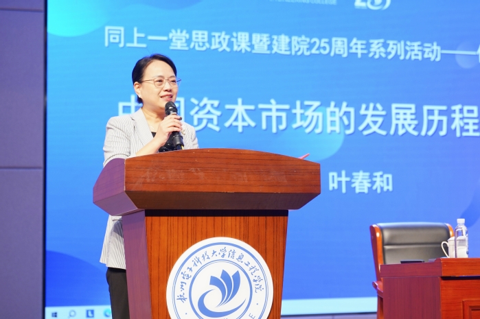 王艳作开场和总结发言。她表示,金融是“国之大者”,关系中国式现代化建设全局,而资本市场是金融市场的重要组成部分。在当前经济全球化与金融市场日新月异的背景下,了解中国资本市场的发展历程及启示,对于我们准确把握未来经济发展趋势、提升金融素养具有重要意义。王艳强调,未来我们将继续立足实际,融合电子信息特色与金融管理,深入推进特色创新人才培养,为中国资本市场的健康、高质量发展贡献信工力量。
