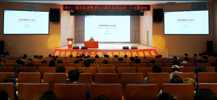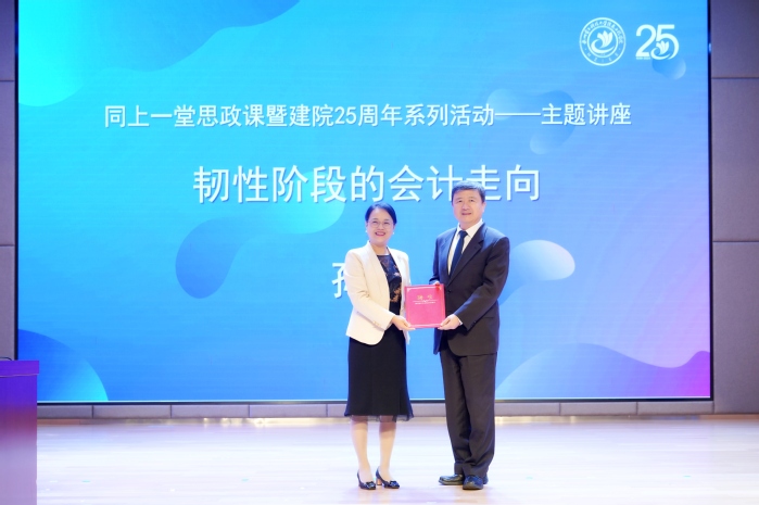11月6日,“同上一堂思政课”系列讲座《韧性阶段的会计走向》在图书馆报告厅举行。本次活动特邀经济学(会计学)博士、上海财经大学资深教授、原上海财经大学副校长兼商学院院长孙铮教授担任主讲嘉宾,学院党委书记王艳、党委副书记彭萌萌、特聘教授王泽霞、管理学院党总支书记潘慧灵、副院长牟辉及400余名师生等参与本场讲座。讲座由彭萌萌主持。
