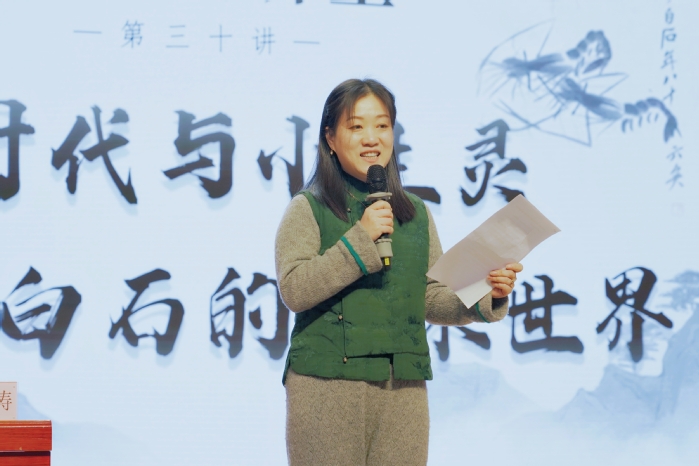 讲座上,张涛首先概述了齐白石的艺术人生。他指出,齐白石以农民出身而至职业画家、艺专教授,再到人民艺术家,其艺术成就堪称传奇。在一个动荡不安的大时代背景下,齐白石用他充满温情的画笔,描绘出充满生机的一草一木、虾蟹鱼虫,从而写下了自己的艺术故事。随后,张涛详细探讨了齐白石走上职业化之路的过程、艺术风格的塑成,通过具体的艺术作品画作实例,深入剖析了齐白石的艺术特色和创作手法。他强调,齐白石的艺术风格独特而鲜明,其画作不仅具有极高的艺术价值,更蕴含着深厚的文化底蕴。