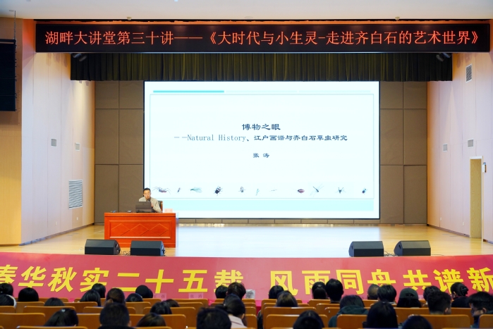 12月2日,湖畔大讲堂第三十讲《大时代与小生灵—走进齐白石的艺术世界》在我院图书馆报告厅举行。本期湖畔大讲堂由中央美术学院副教授、硕士研究生导师张涛担任主讲嘉宾,特邀中国美术家协会会员、浙江省美术家协会理事周燕和知名策展人王蓓莅临现场,学院党委书记王艳,副院长郑皓,纪委书记张馨艺,文理学院党总支书记张朝霞,文理学院执行院长李承家出席本次讲座,讲座由周燕主持。