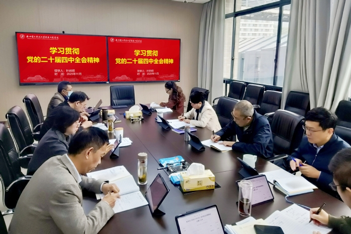 11月4日上午,学院党委理论学习中心组举行专题学习会,围绕“学习贯彻党的二十届四中全会精神”开展集中学习研讨。学院党委书记王艳主持会议,学院副院长叶岩明领学,学院副院长郑皓、副院长卢文军作交流发言,学院党委理论学习中心组成员参会。