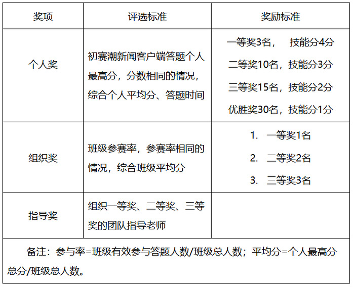 本次竞赛设个人奖、组织奖、指导奖。具体详见下表。此类比赛为省级学科竞赛,参与并获得有效成绩即可获活动章1枚加德育分0.5分。