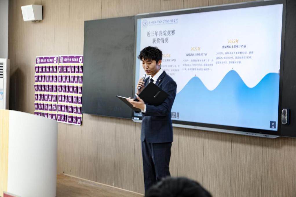 会议伊始,分享人李泽同向同学们讲述学院近几年学科竞赛中取得的优异成绩及学院的竞赛奖励机制。