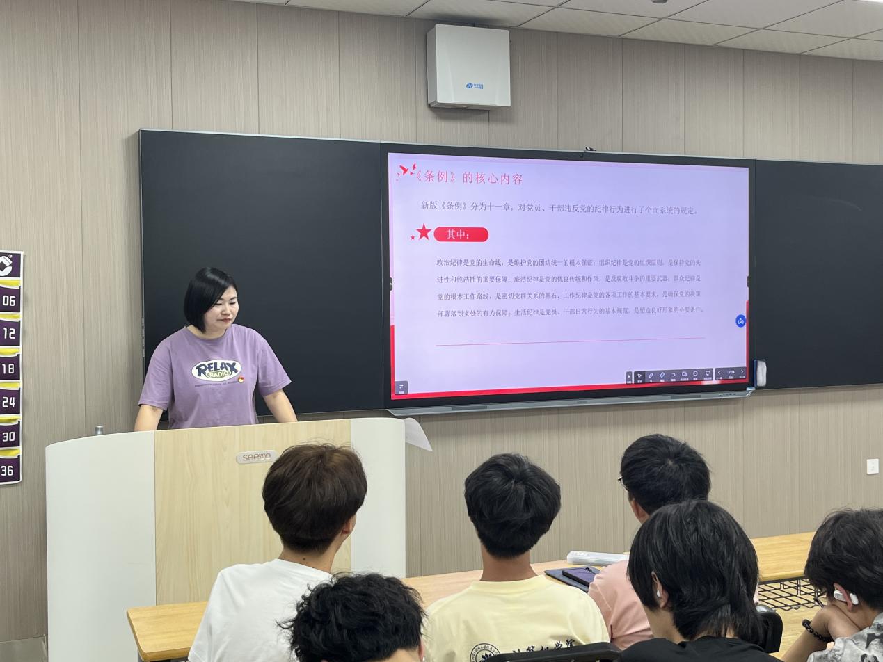 近日,为深入贯彻落实全面从严治党要求,加强党的纪律建设,计算机学院分别在C209教室和B301教室开展了两场“《中国共产党纪律处分条例》的解读与实践教育”专题党课。两次党课均由学院党总支副书记章玉婷主讲,旨在帮助师生党员深刻理解新修订《条例》的精神实质,提升纪律意识和规矩意识。