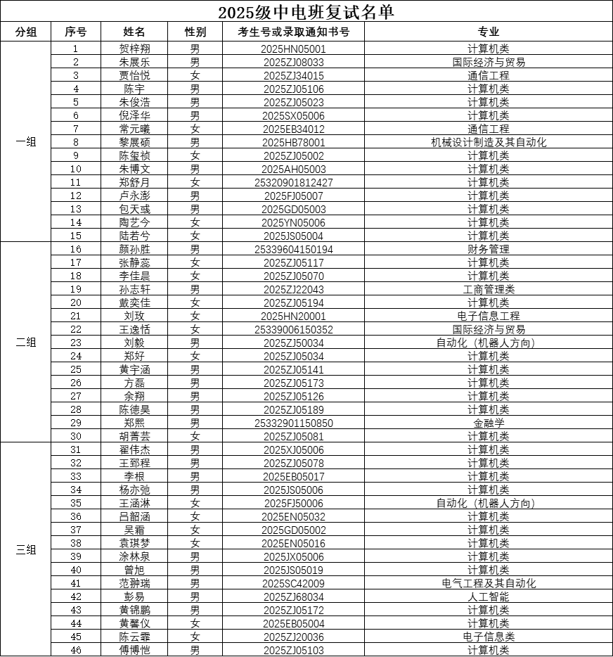 根据《关于2025级计算机科学与技术(中电联合培养)特色班招生报名的通知》,经报名、资格审查、心理测试、线上笔试等环节,现将计算机学院2025级中电班复试名单予以公示。具体如下: