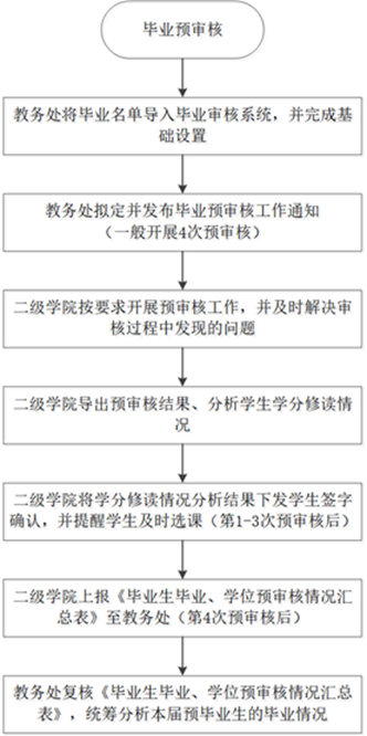 1.二级学院按要求开展预审核工作:①核对教学计划;②核对毕业要求学分;③设置审核条件等;并及时联系教务处相应老师解决审核过程中发现的问题。