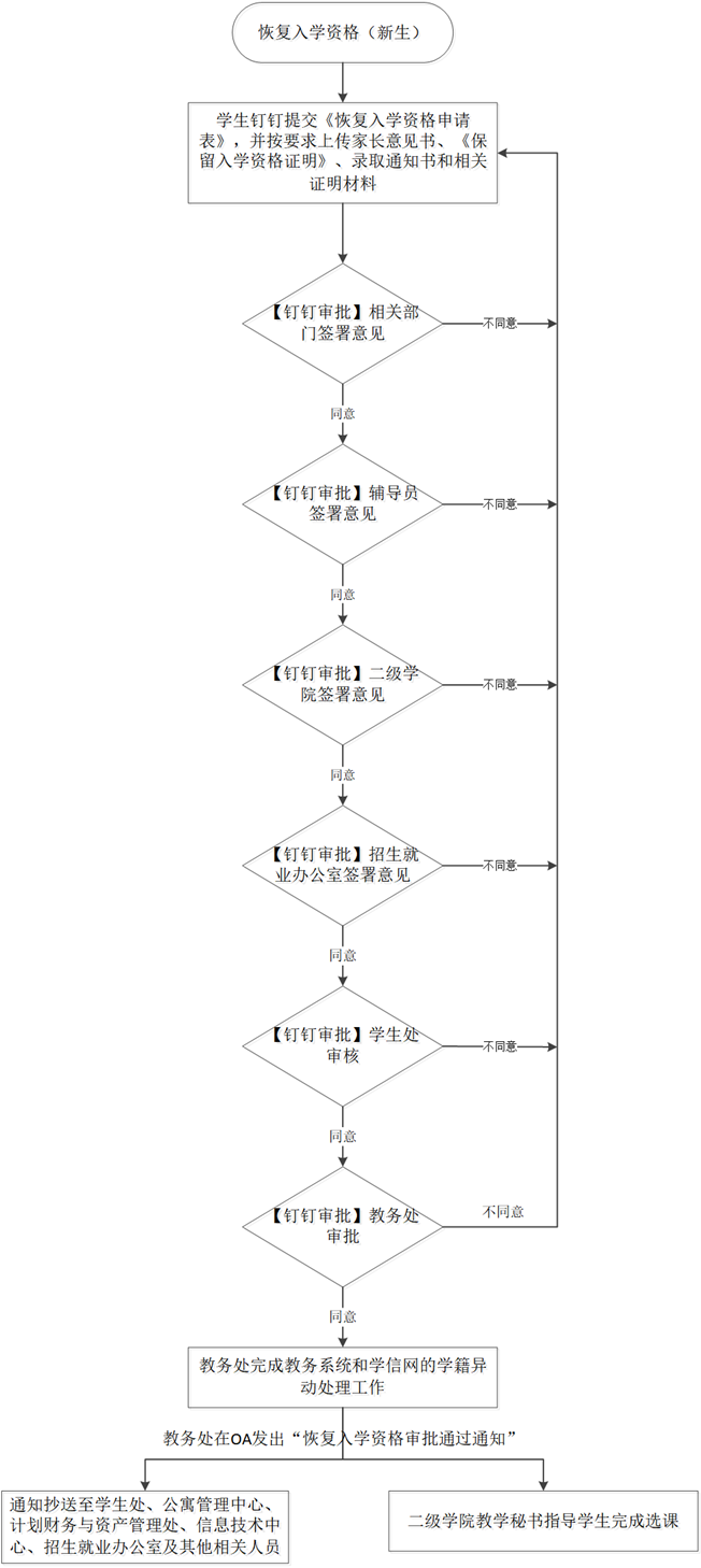 2.因退伍原因恢复入学资格材料由人民武装部签署意见;因病-身体原因恢复入学资格材料由校医院签署意见,因病-心理原因恢复入学资格材料由心理健康与生命教育中心签署意见;二级学院签署意见;招生就业办公室签署意见;学生处审核。