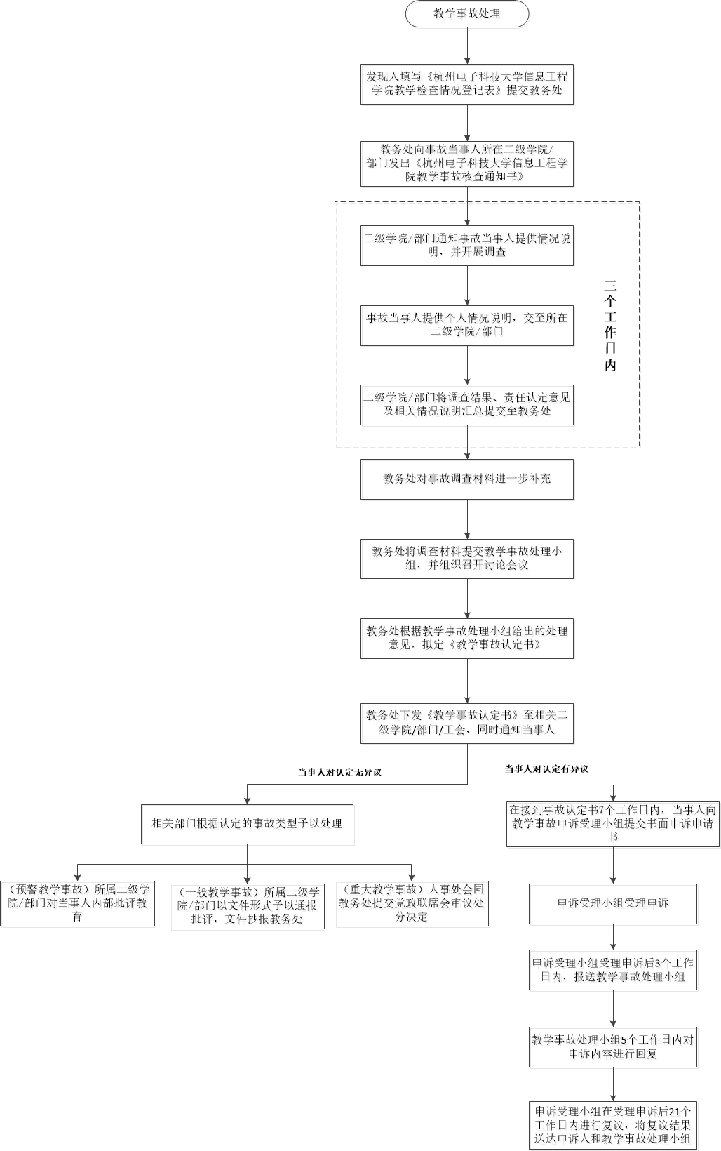 7.教务处根据教学事故处理小组的讨论结果拟定《教学事故认定书》,并下达给当事人所在二级学院/部门,由当事人所在二级学院/部门送达当事人本人。