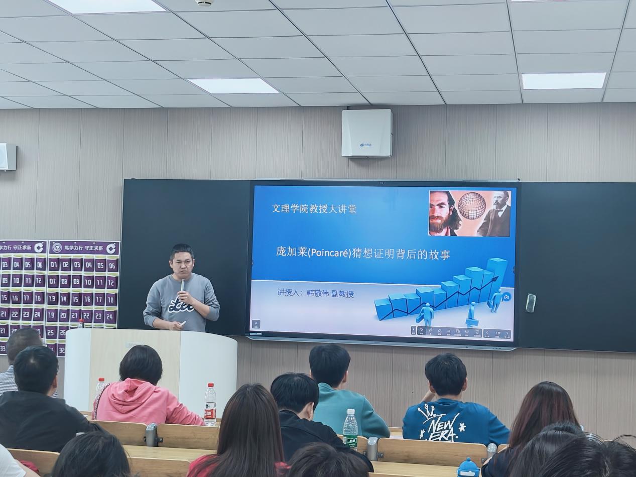 4月24日下午13:45,文理大讲堂在C107教室举行。本次活动,韩敬伟老师受邀作为主讲人,开展了题为《庞加莱(Poincaré)猜想证明背后的故事》的讲座,旨在拓宽同学们对庞加莱猜想的认识,以及了解数学家佩雷尔曼的传奇人生。此次讲座由文理学院执行院长李承家教授主持,吸引了众多师生的关注,气氛热烈。